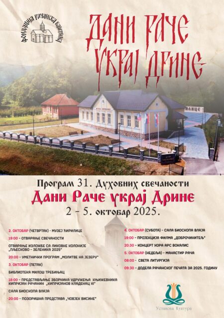 Духовне свечаности „Дани Раче украј Дрине“ одржавају се сваке године у првој недељи октобра, у организацији Установе „Култура“ и Фондације „Рачанска баштина“, а под покровитељством Општине Бајина Башта. Посетиоци манифестације имаће прилику и ове године да уживају у богатом програму из области уметности и културе. Ове године признање „Рачански печат“ за очување вере и традиције, подизање храмова на територији општине Бајина Башта и предан рад на уздизању духовног живота заједнице добија Црквена општина Бајина Башта. Овогодишњи програм, једне од најзначајнијих културних манифестација у Србији, почиње у четвртак, 2. октобра 2025. године у Музеју ћирилице. Након свечаног отварања, у 19 часова, посетиоци ће моћи да погледају изложбу радова са ликовне колоније „Пљесково–Зеленика 2025“, док ће од 20 часова бити изведен уметнички програм под називом „Молитве на језеру“. Програм се наставља у петак, 3. октобра, представљањем зборника Удружења књижевника „Кипријан Рачанин“ под називом „Кипријанов кладенац XI“, у 18 часова у библиотеци „Милош Требињац“. Истe вечери, у сали биоскопа „Влаја“ у Бајиној Башти, биће изведена позоришна представа „Човјек висине“. У суботу, 4. октобра, такође у биоскопу „Влаја“, љубитељи филмске уметности моћи ће да погледају пројекцију филма „Доброчинитељ“, након чега следи концерт хора Арс вокалис. У недељу, 5. октобра, након Свете литургије у манастиру Рача, биће уприличен и најзначајнији догађај манифестације, свечана додела Рачанског печата за 2025. годину.
