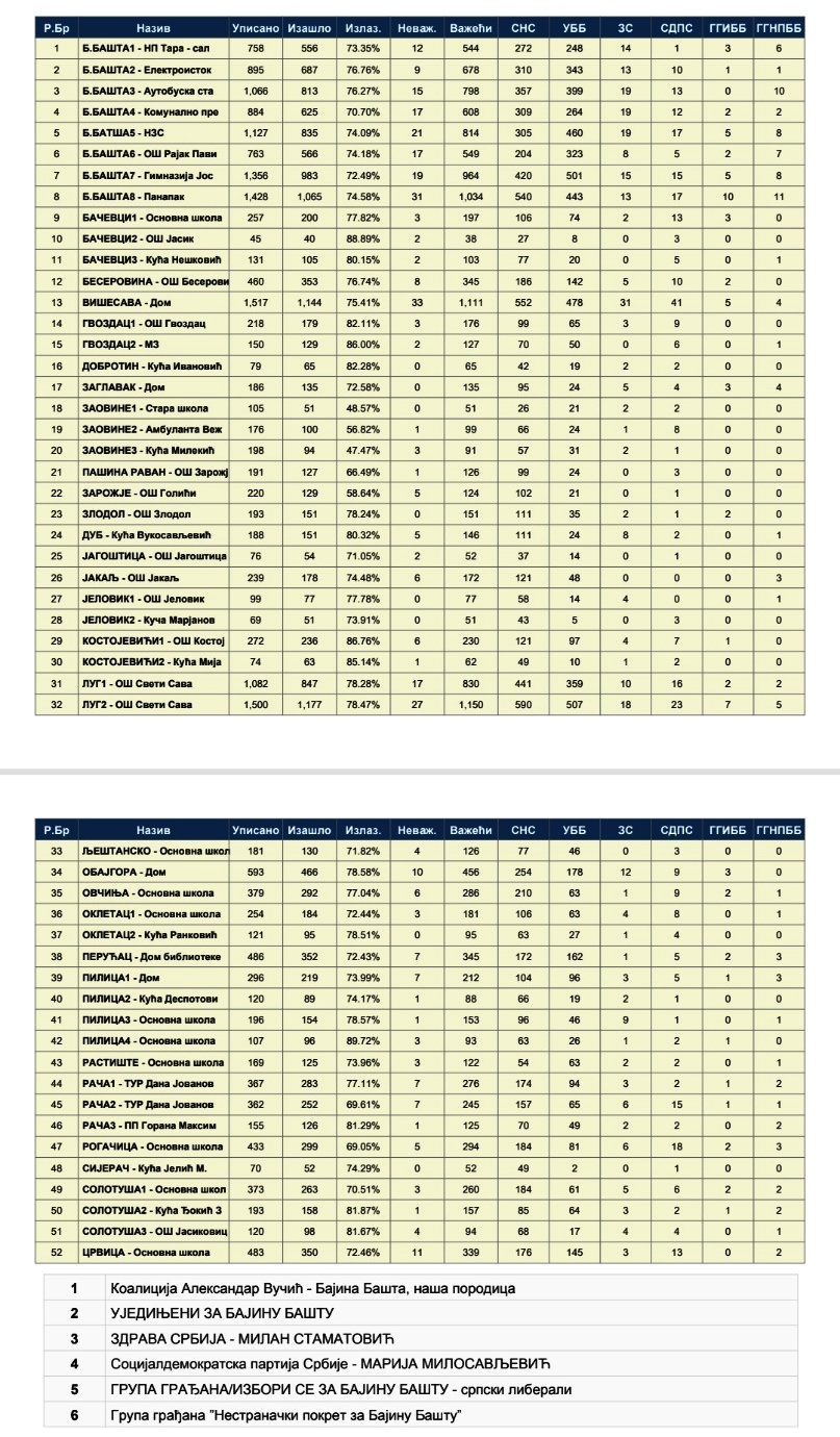 На јучерашњим изборима за локални парламент у Бајиној Башти, према прелиминарним резултатима, највише гласова освојила је “Коалиција Александар Вучић – Бајина Башта – наша породица“ за коју се определило 8.415 бирача , односно 53,61 одсто , ,док је ЛистА Уједињени за Бајину Башту“ добила је 41,17 одсто подршке бирача. Остале четири изборне листе нису прешле цензуз од три одсто. Здрава Србија – Милан Стаматовић“ освојила је 1,83 одсто, “Социјалдемократска партија Србије – Марија Милосављевић“ 2,32 , “Група грађана/Избори се за Бајину Башту – српски либерали“ 0,44 , “Група грађана Нестраначки покрет за Бајину Башту“ 0,64 одсто гласова. Излазност је јуче била висока, на биралишта је јуче изашло 1 5.699 грађана, или 73,2 одсто од укупног броја уписаних бирача.