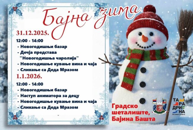 - Уторак, 31. децембар (12.00 – 14.00 часова): Посетиоце очекује свечано отварање Новогодишњег базара, дечја представа „Новогодишња чаролија“, традиционално кување вина и чаја, као и незаобилазно дружење и фотографисање са Деда Мразом.