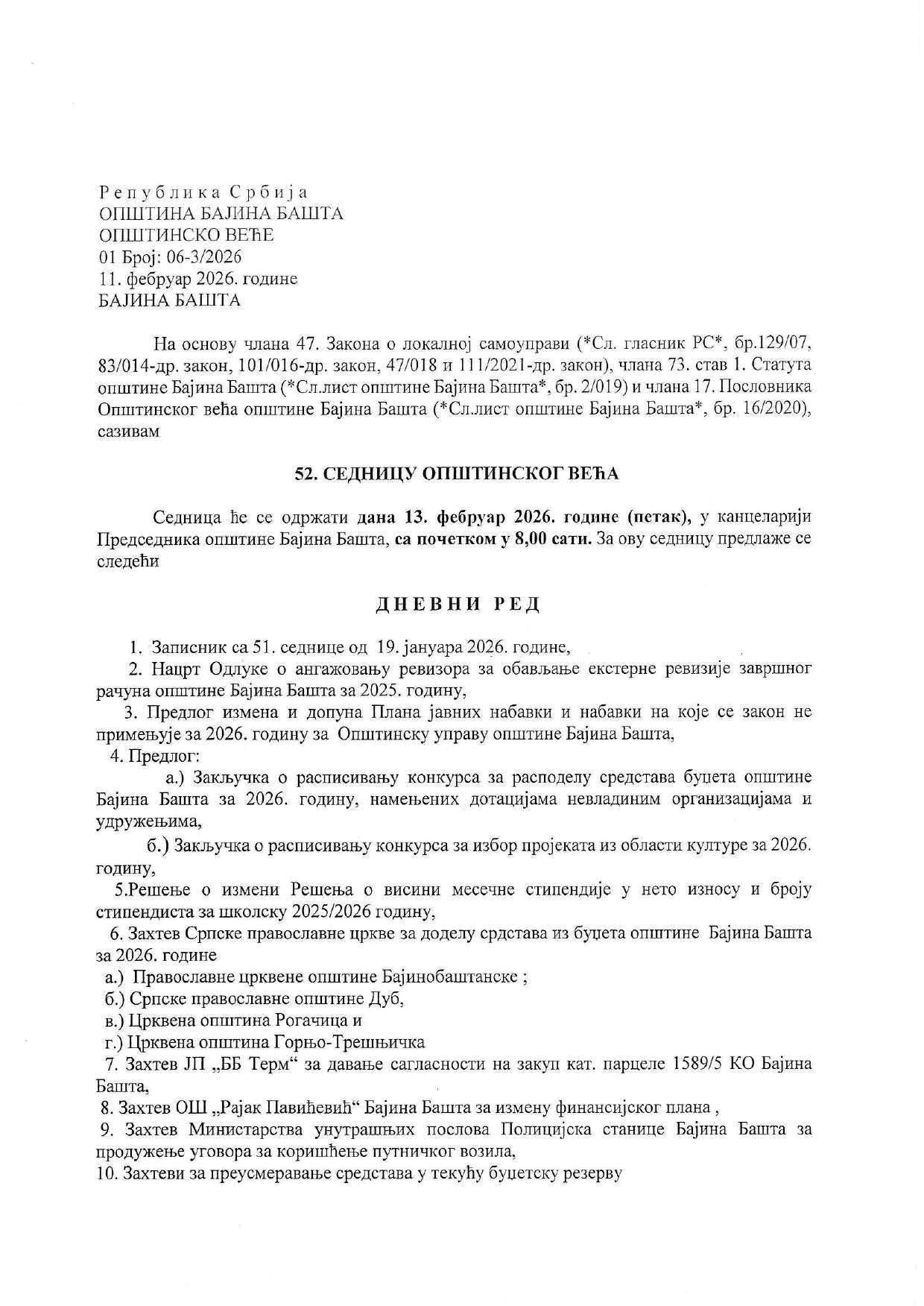 Заказана 52. седница Општинског већа за 13.2. 2026.